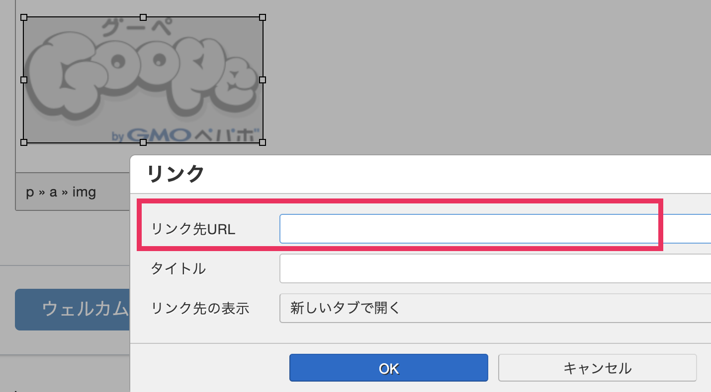 - 「リンク先URL」へ遷移させたいURLを入力し、「OK」をクリック