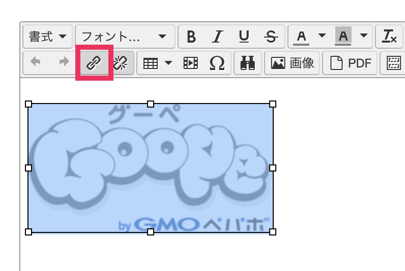 画像横の余白をクリックした後、[Shift]キーを押しながら[←](左矢印キー)をクリック - ツールバーの「リンクの挿入・編集」ボタンをクリック