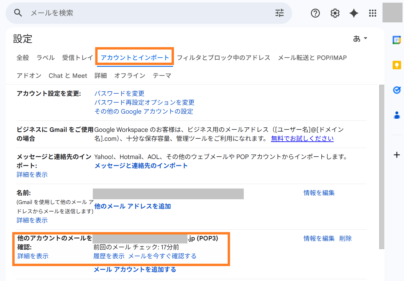 ここにメールアドレスが表示されている場合、GmailによるPOP接続(メールの取り込み)が行われています。
