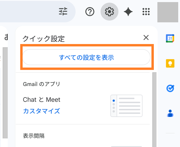 Gmailにログインし、画面右上の[設定](歯車アイコン)をクリック